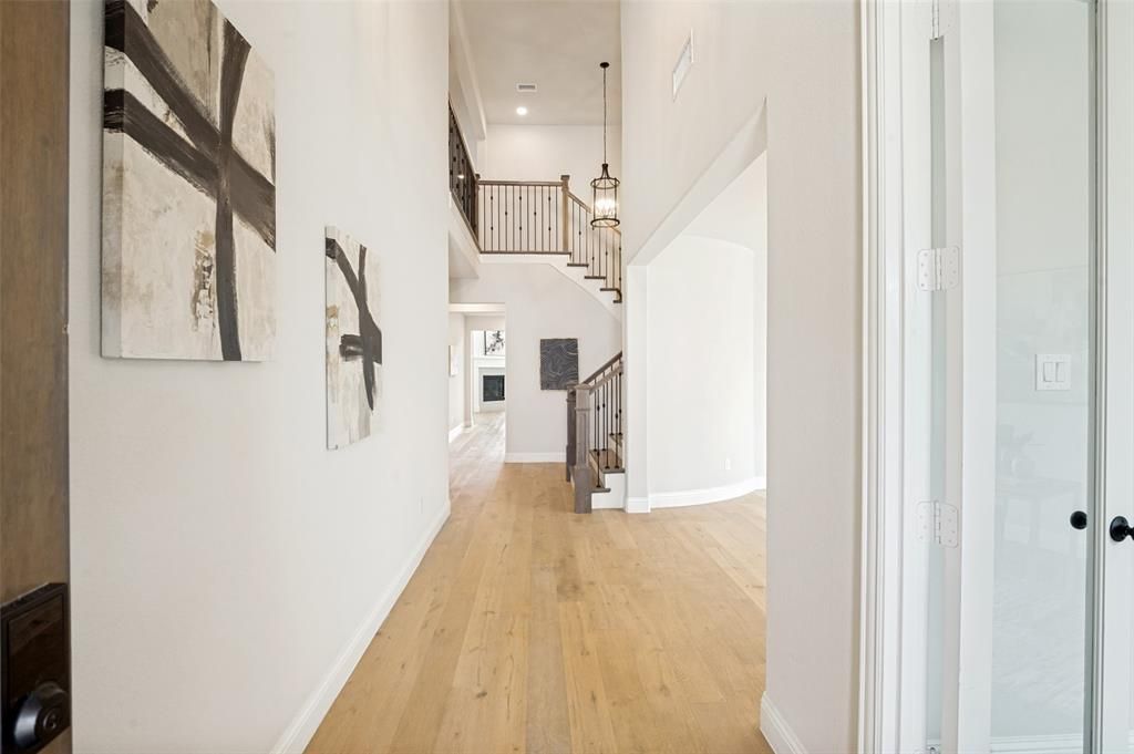 Luxurious & Modern Home at PRIME Location in Golf Course community of Castle Hills!. Welcome to this stunning, like-new home built in 2022, located in the highly desirable Castle Hills community. This immaculate 5-bedroom, 4-bath home offers the perfect blend of style, space, and convenience. Step inside to a grand curved staircase with elegant wrought iron railing and wood staircase, setting the tone for the home’s sophisticated design. The thoughtfully designed floor plan features a 5 bedrooms, Master Bed, Guest Bed room PLUS private study downstairs, 3 Bed, a spacious GAME room, and a dedicated MEDIA room UPSTAIRS, perfect for both work and entertainment. The chef’s dream kitchen is equipped with stainless steel appliances, an expansive backsplash and countertop, under-cabinet lighting, upgraded appliances, and abundant cabinetry, seamlessly opening to the inviting living area with a cozy and modern fireplace. A formal dining room and butler’s pantry add both function and elegance. Enjoy wood and ceramic tile flooring throughout the main living areas, combining durability with modern appeal. The luxurious primary suite is a true retreat, featuring bay windows and a spa-like atmosphere, with a tub in the main bath and frameless glass in the shower, designed for relaxation. Step outside to a covered patio and large backyard, ideal for entertaining or enjoying peaceful mornings and evenings. Castle Hills HOA offers multiple swimming pools, parks and playgrounds, tennis, basketball and PB courts, and walking trails, with locations within walking distance from the house. Conveniently located just minutes from Highway 121, with easy access to Grandscape, Legacy West, and a wide array of dining, shopping, and entertainment options. DFW International Airport is only about 15 minutes away, making travel effortless. Don’t miss this exceptional opportunity to own a beautiful home in one of the area’s most sought-after communities.